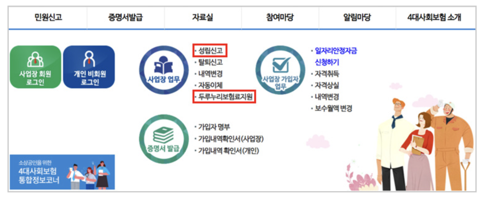 - 미가입 사업장의 경우 - 4대사회보험 정보연계센터 사이트 -> 사업장업무 -> 성립신고(두루누리보험료지원 체크)