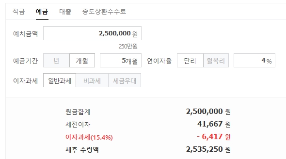 그리고 6번에 해당하는 250만 원을 5개월 동안 4%짜리 파킹 통장에 보관했을 때 나오는 세전 이자는 41,667원, 세후이자 35,250원입니다.