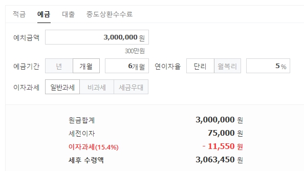 - 남은 300만원은 6개월짜리 정기예금 상품에 가입을 한다. (예로 5%로 가정)