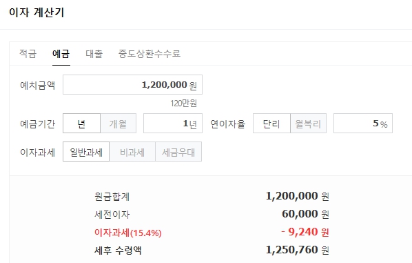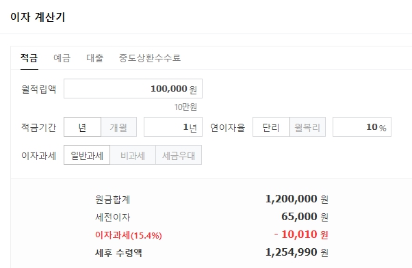 아래 사진에 보시는 바와 같이 적금 10% 상품에 매월 10만 원씩 1년 가입했을 때와 예금 5% 상품에 120만 원 1년 가입했을 때 금리는 2배 차이가 나는데도 불구하고 이자 차이는 크게 차이가 없다.