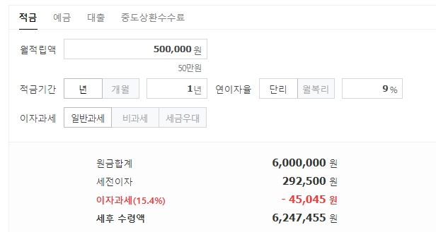 위와 같이 적금 상품에 가입했을 때 600만 원에 대한 세전 이자는 292,500원, 세후이자 247,455원이 됩니다.