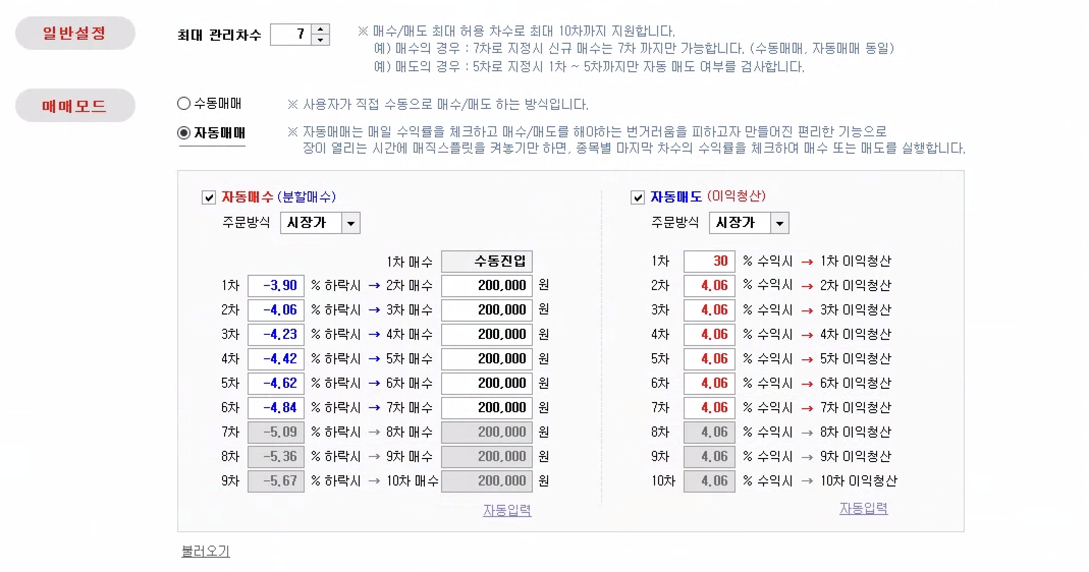 종목만 선별하여 1차 매수만 수동으로 진행을 하고, 그 뒤로는 매매 설정을 통해서 자동매매가 가능하게 된다.