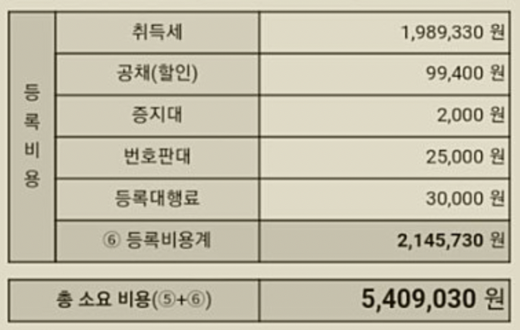 차량 구입 시 받아볼 수 있는 견적서에서 차량 등록비용이 적힌 칸을 보면 제일 상단에 취득세가 있고, 그 아래에 공채(할인)이 적혀있습니다.