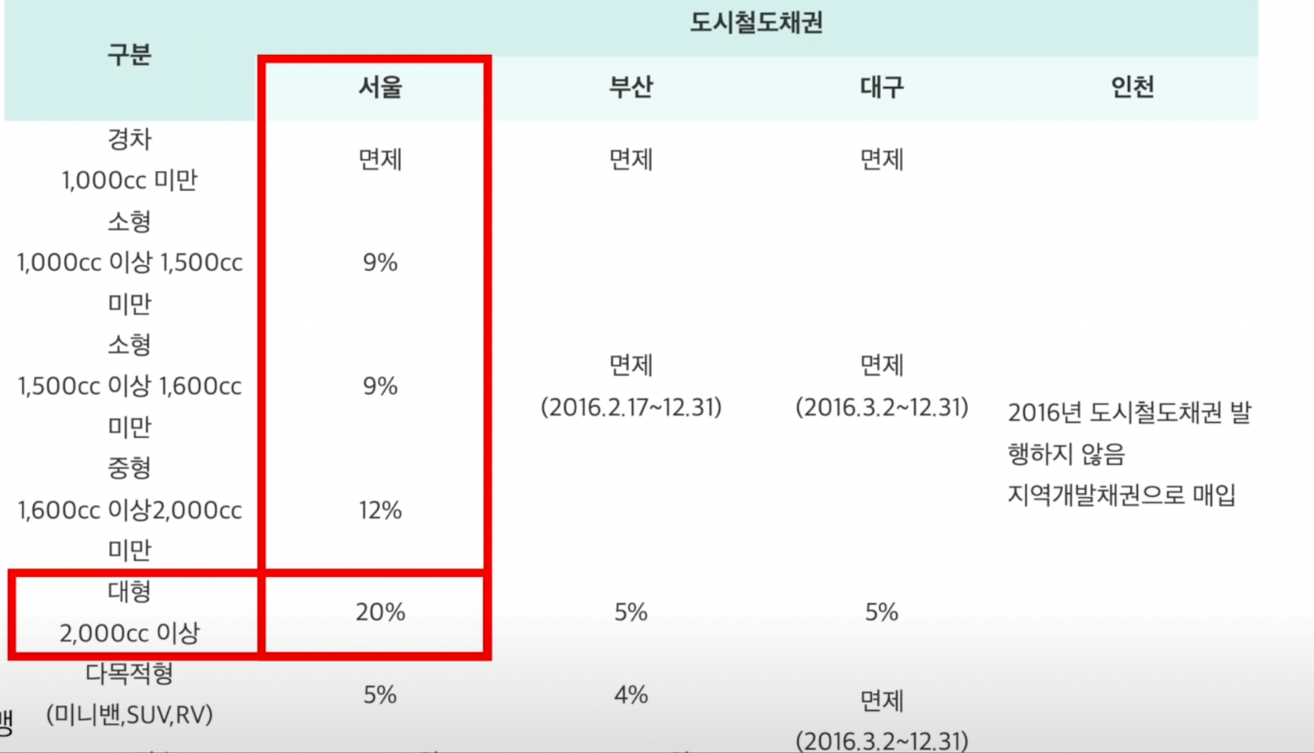 예를 들어서 2000cc 미만 차량을 구입할 때 차량가의 4~12%(대전 4%, 강원도 8%, 서울시 12%)의 채권을 의무적으로 매입해야 합니다.