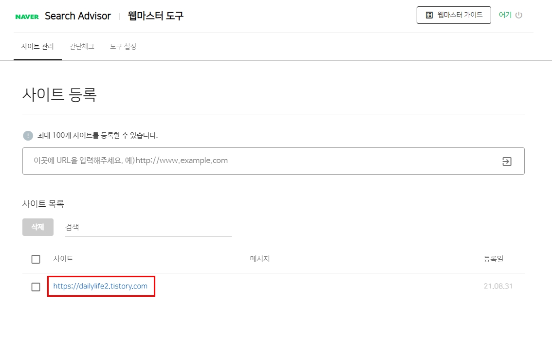 거기에 내가 사용하고 있는 티스토리 블로그 주소를 입력해준다.