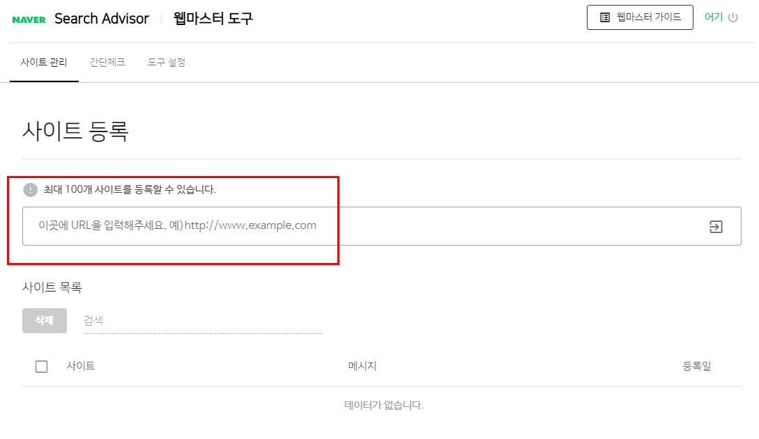 로그인을하고 웹마스터 도구에 들어오게되면 사이트 등록이라는 큰 글씨가 보인다.