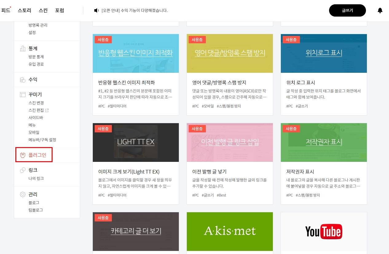 그러고 티스토리 관리자 페이지에서 플러그인을 들어간다.