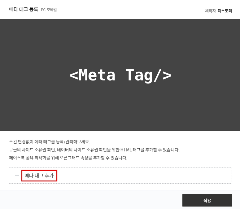 다시 티스토리 블로그 관리자 페이지에 플러그인에 들어오면 Meta Tag/ 메타 태그 등록이라는것이 있다.
