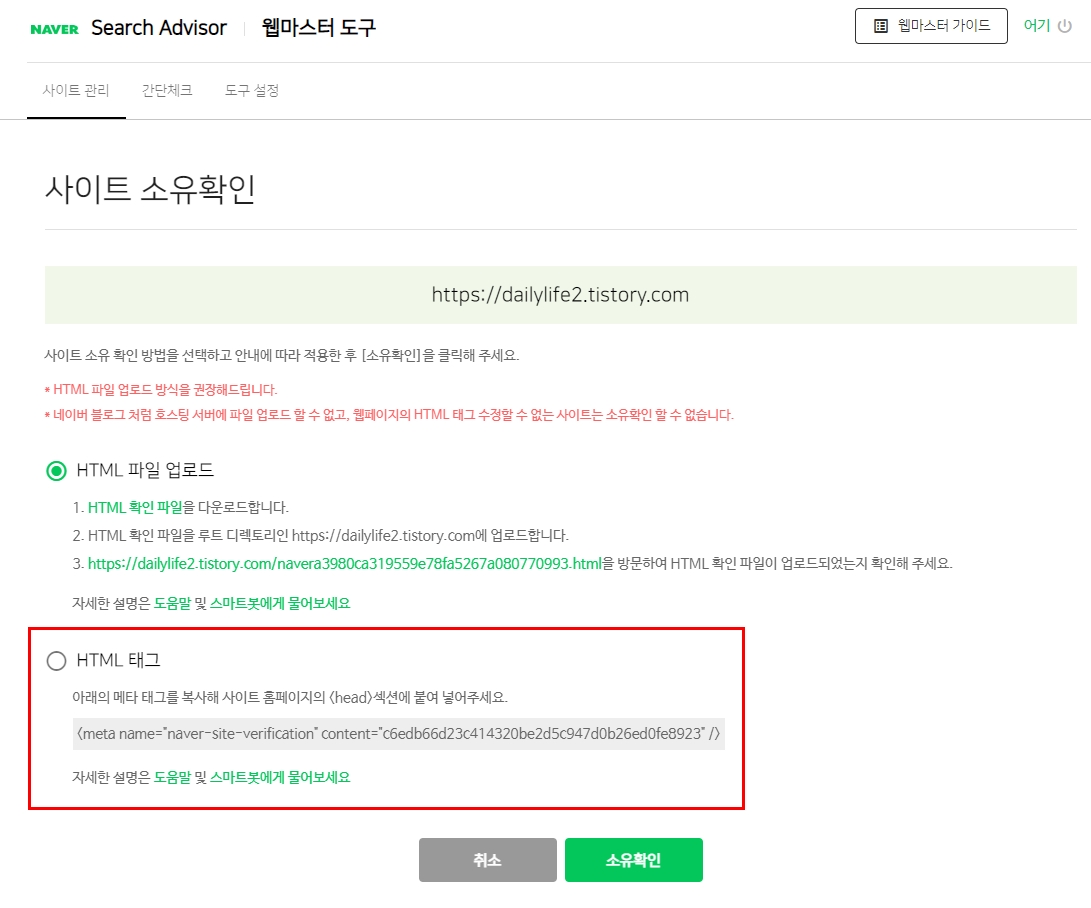 티스토리 블로그 주소를 입력하고나면 사이트 소유확인이라는 글이 나온다.