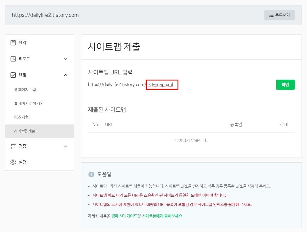 이것도 URL을 입력하면되는데, 티스토리 블로그 주소뒤에 /sitemap.xml 을 적으면된다.