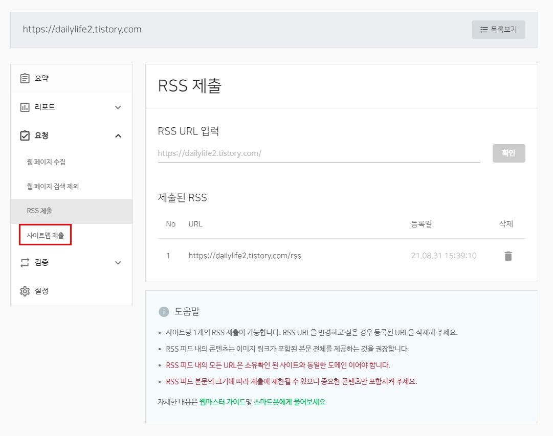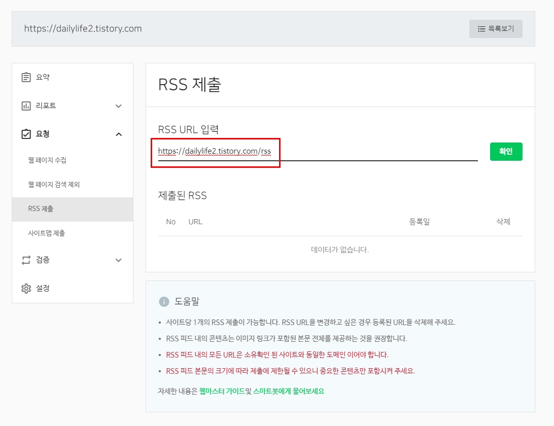 왼쪽 상단에 있는 요청을 클릭하면 RSS 제출이라는게 보인다.