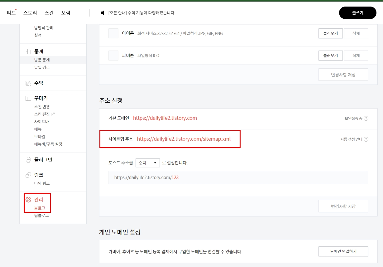 정상적으로 되어있는지 확인하기위해서는 티스토리 블로그 관리자 페이지에 들어간다.