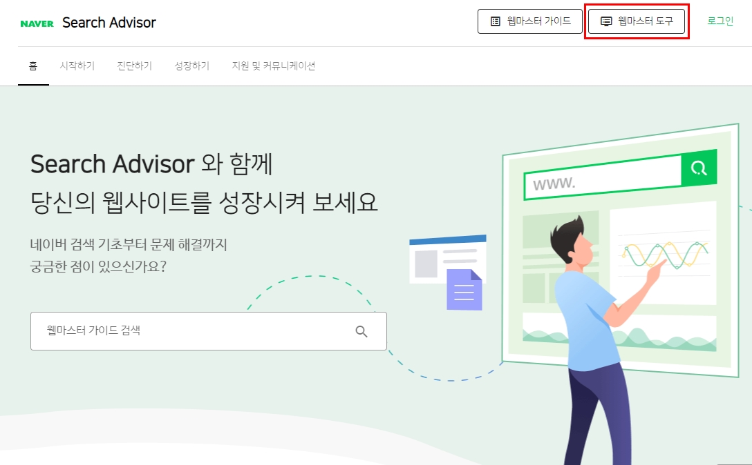 서치어드바이저 페이지에 들어오게되면 오른쪽 상단에 웹마스터 도구를 클릭해준다.