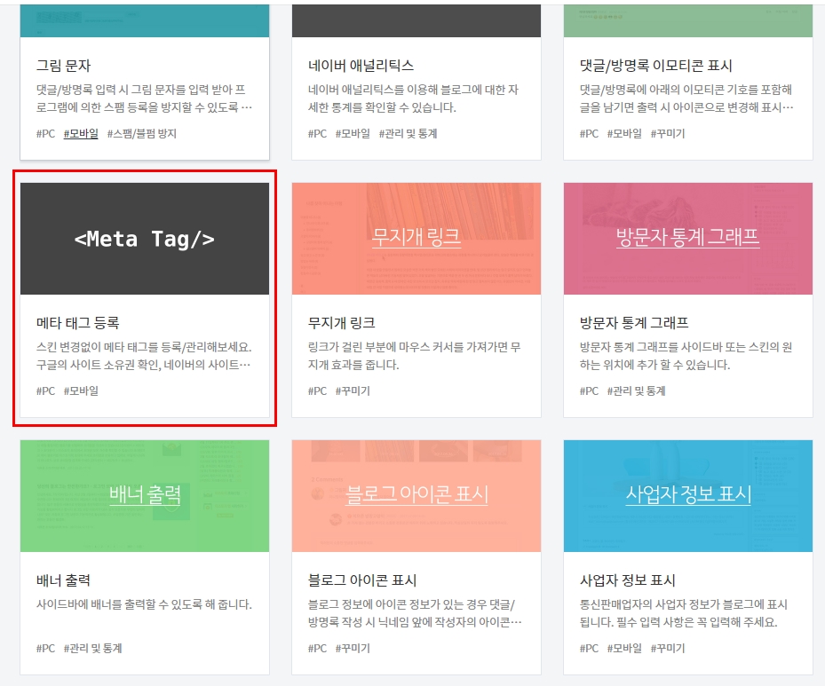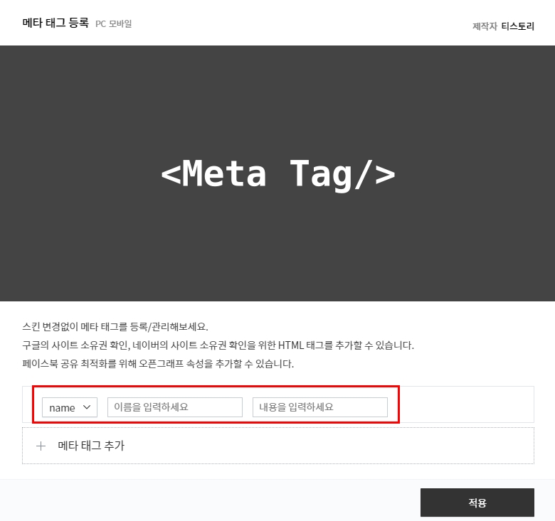 다시 티스토리 블로그 관리자 페이지에 플러그인에 들어오면 Meta Tag/ 메타 태그 등록이라는것이 있다.
