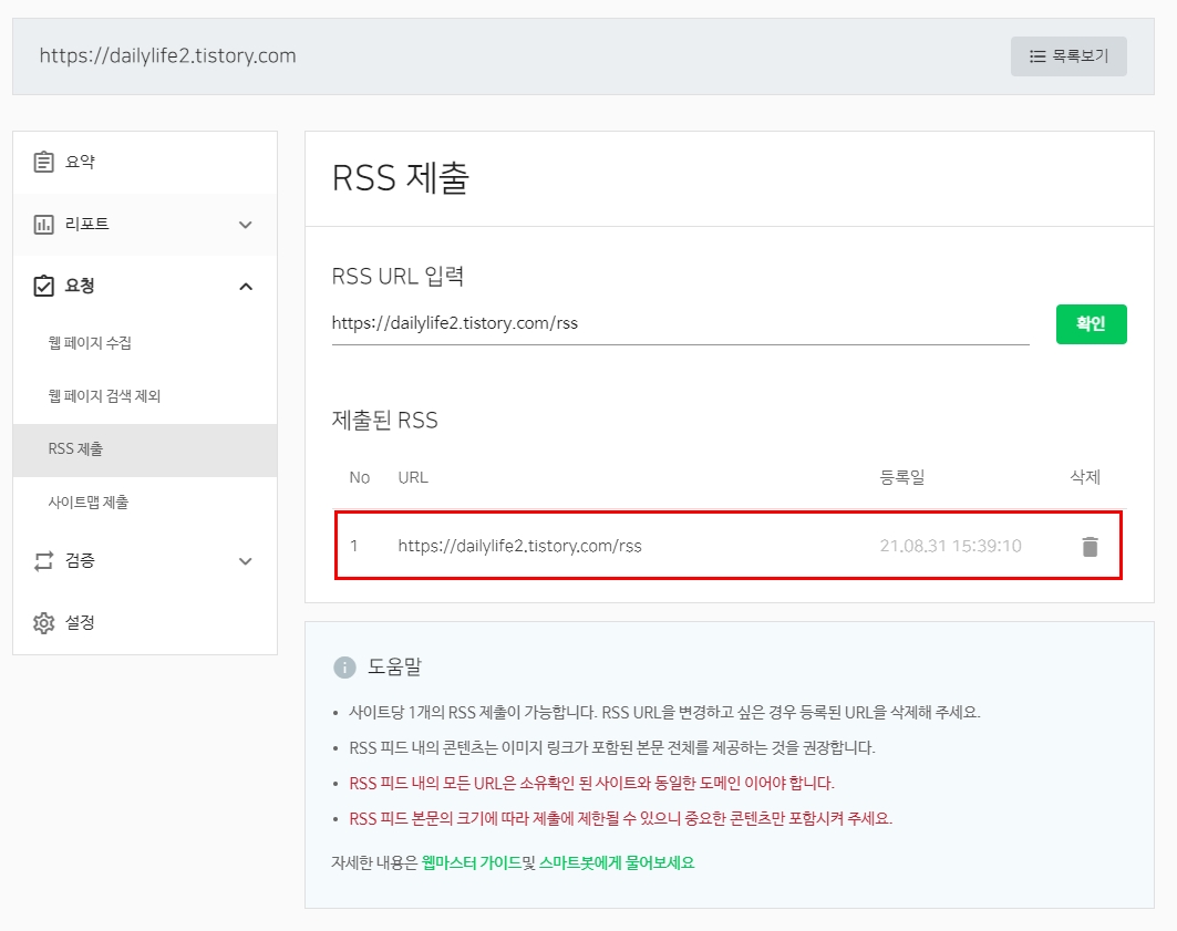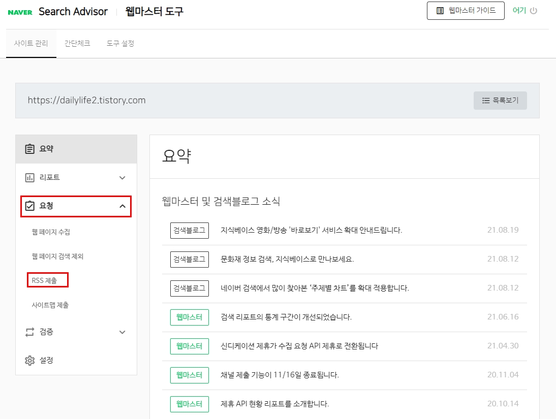 왼쪽 상단에 있는 요청을 클릭하면 RSS 제출이라는게 보인다.