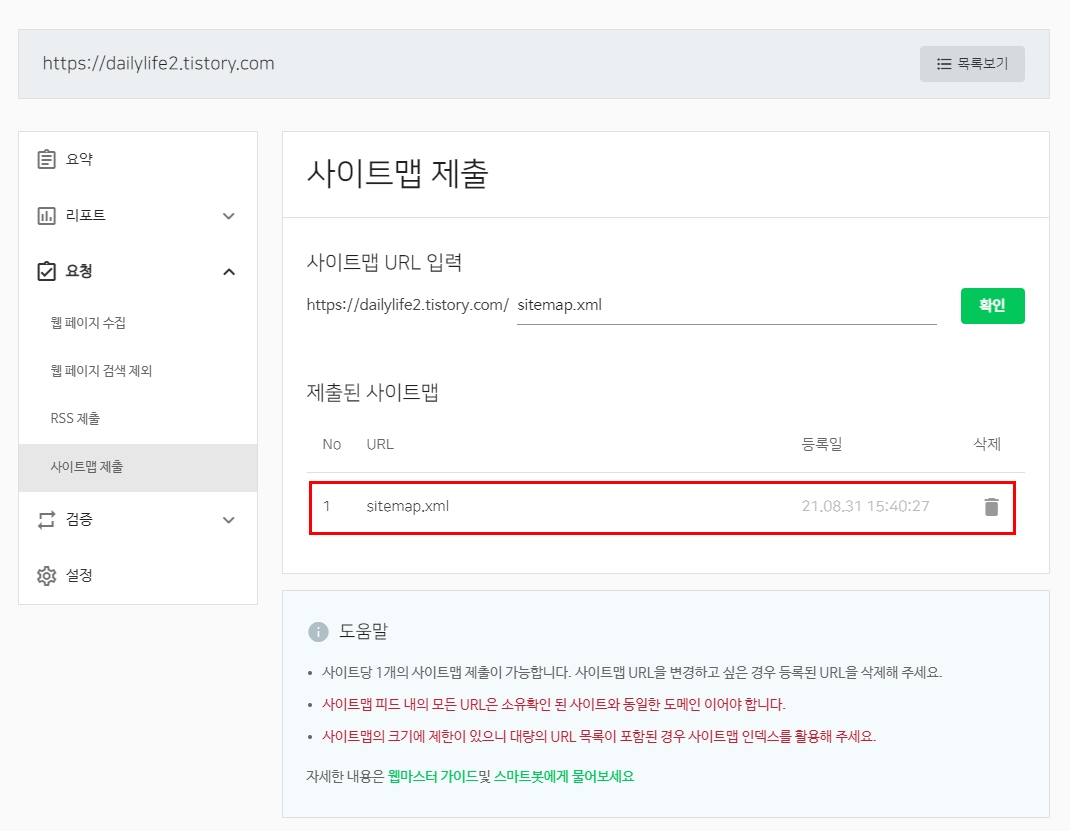 이것도 URL을 입력하면되는데, 티스토리 블로그 주소뒤에 /sitemap.xml 을 적으면된다.