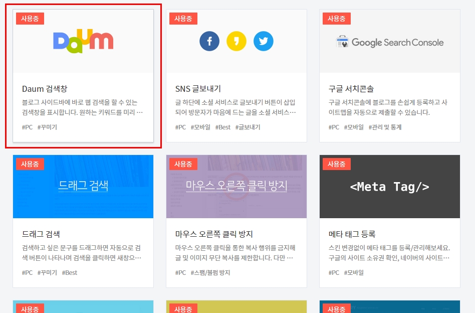 오른쪽 하단에 적용 버튼을 클릭해주면 플러그인 왼쪽 상단에 사용중으로 바뀌게 된다.
