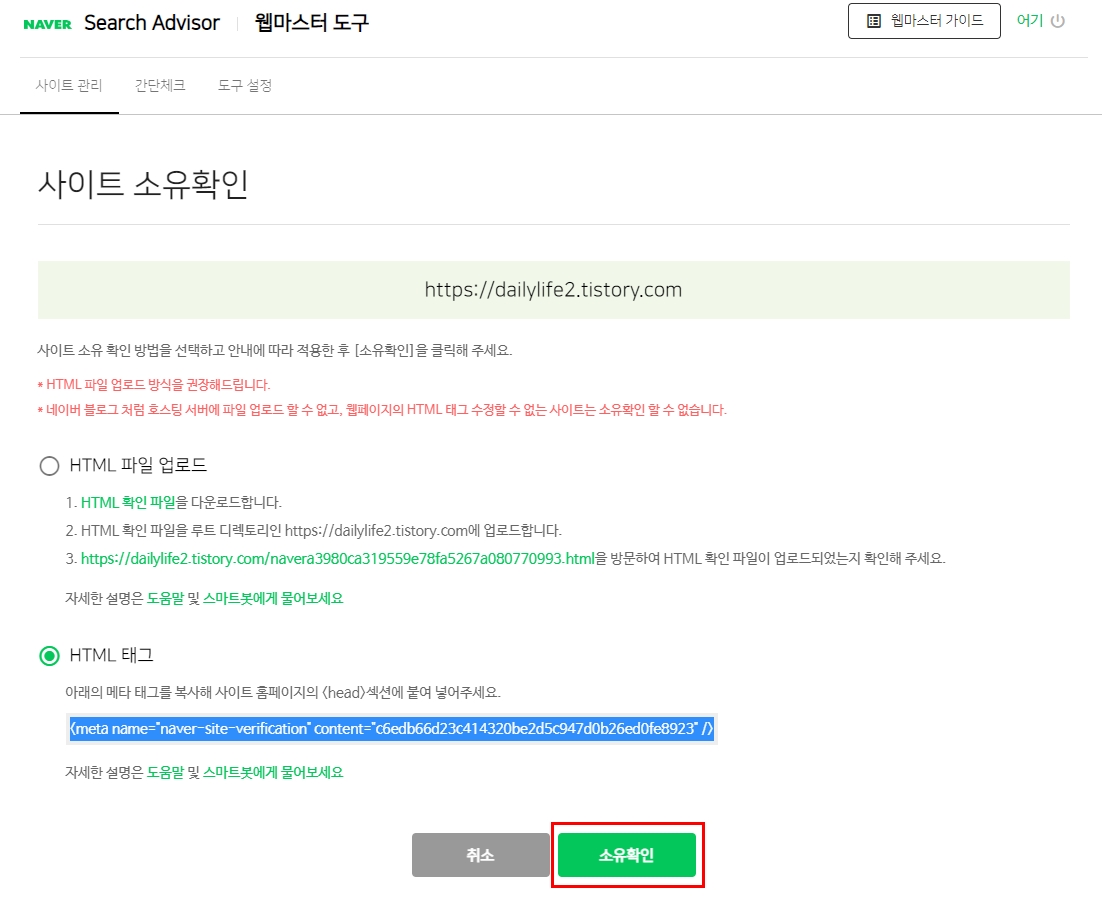 티스토리 블로그 주소를 입력하고나면 사이트 소유확인이라는 글이 나온다.